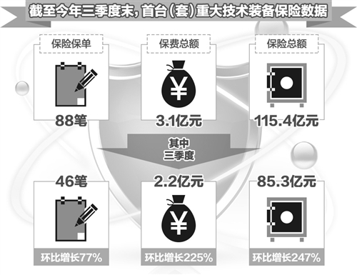 “目前,首台(套)重大技术装备保险补偿机制试点工作已初见成效,投保项目实现量费齐涨。”中国保监会发展改革部相关负责人日前披露,截至今年三季度末,全国共出首台(套)重大技术装备保险保单88笔,保费总额3.1亿元,保险总额115.4亿元。其中,三季度共出保单46笔,环比增长77%;保费收入2.2亿元,环比增长225%;保险总额85.3亿元,环比增长247%。